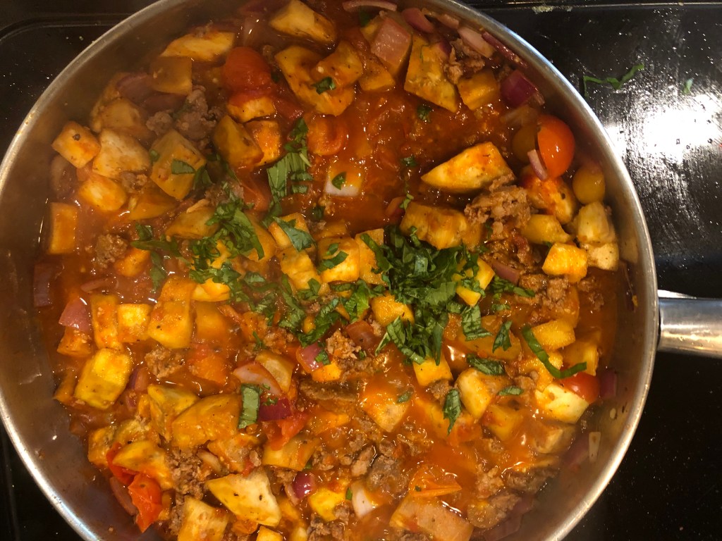 I have had eggplant quite a lot as an adult. It’s always been with an Italian flavor palate. Now I did a riff on Mexico a few months ago, but I just couldn’t do another eggplant Parmesan. You folks know how bored I get with the same food and when I get bored, I experiment. I started with eggplant and then took a turn to the southwest. Cumin, chorizo, smoked paprika, tomatoes, and a good bit of chili powder kicked up the flavor. A little sour cream and some fresh basil bring balance to the dish. I hope you like it.