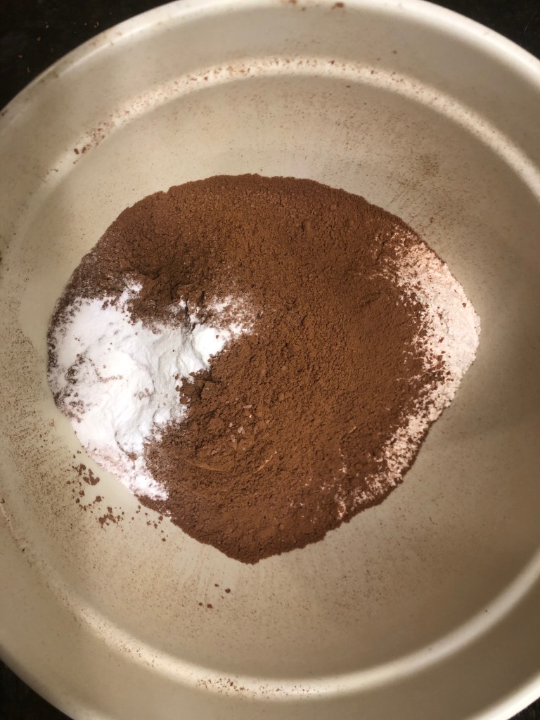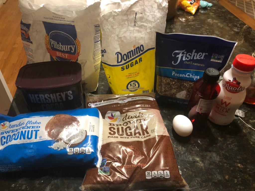 I am in a chocolate mood. I want rich chocolate, but it’s breakfast time; it would be wrong to have chocolate. Not if you make a breakfast food. How about a chocolate pancake, but let’s add the stuff of German chocolate cake: pecans, coconut, caramel. A side of bacon or sausage and you’ve got yourself a winning breakfast or brunch dish. I hope you like it.