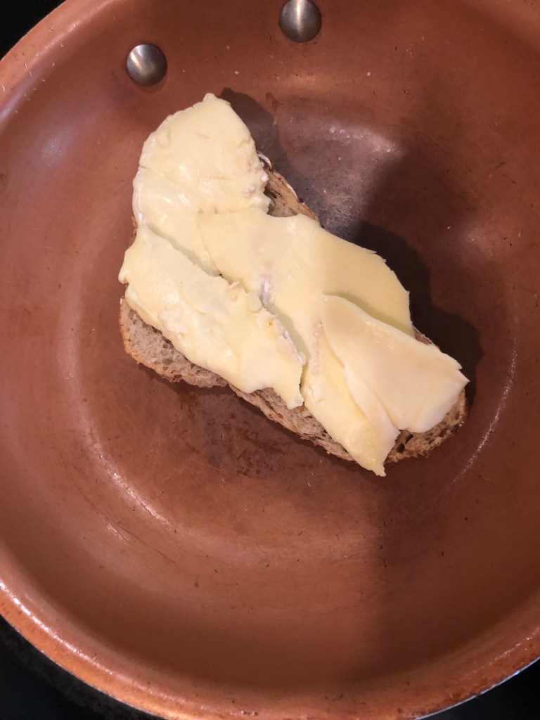 This is not the common grilled ham and cheese sandwich. We start with rye bread – no white Wonder bread here. Now, on the inside, no, we are not going to use Oscar or Kraft. We will use prosciutto ham, Brie cheese, Granny Smith apple slices, and some spicy brown mustard. That will give us a sandwich which is salty, sour, melty, spicy, and most importantly, delicious. The other wrinkle is the use of real butter on the bread to make the outside crispy to contrast against the gooey inside. I hope you like it.