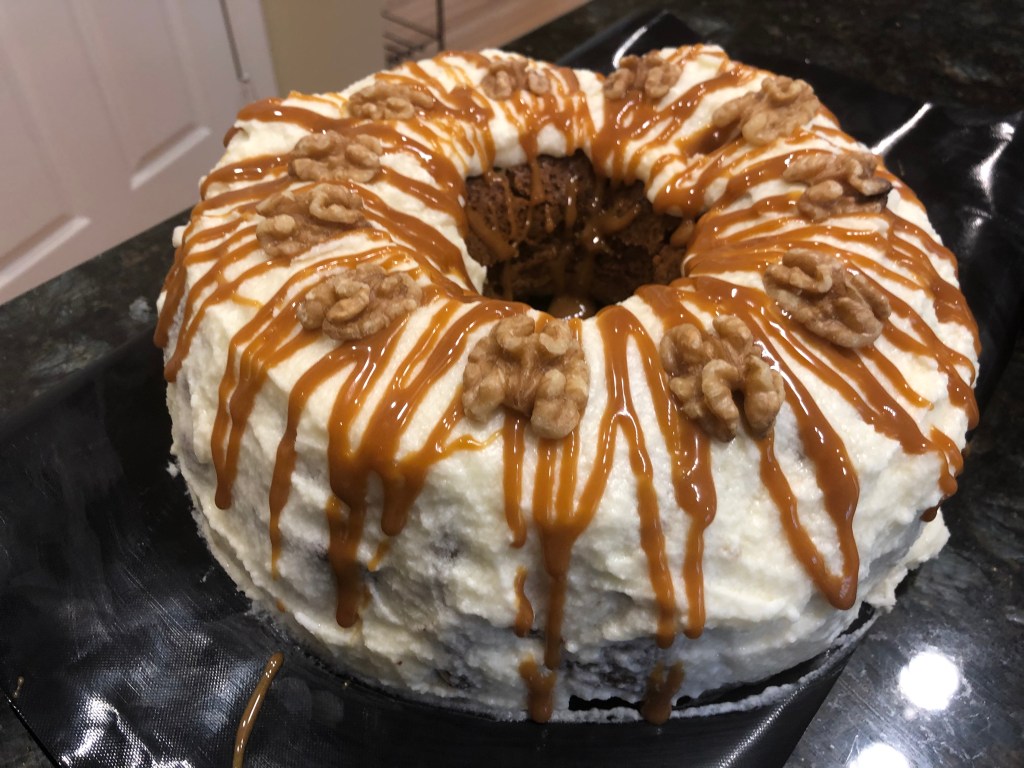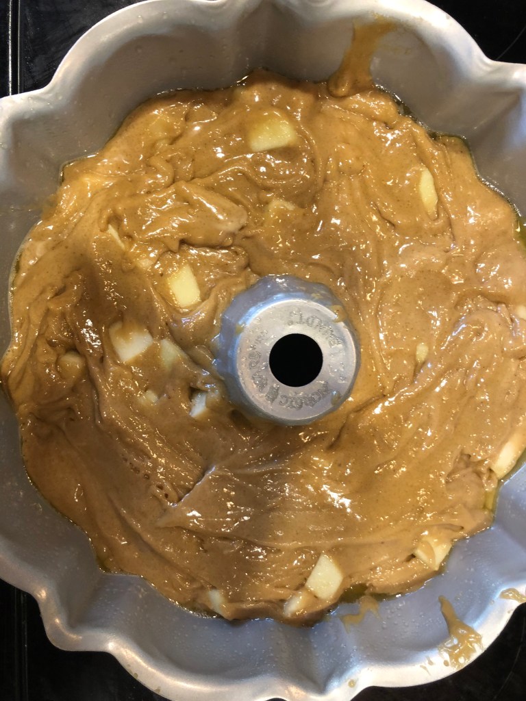 Butter and flour Bundt pan. (Dire warning: Don’t just use cooking spray, or the top of the cake will stick to the pan!)