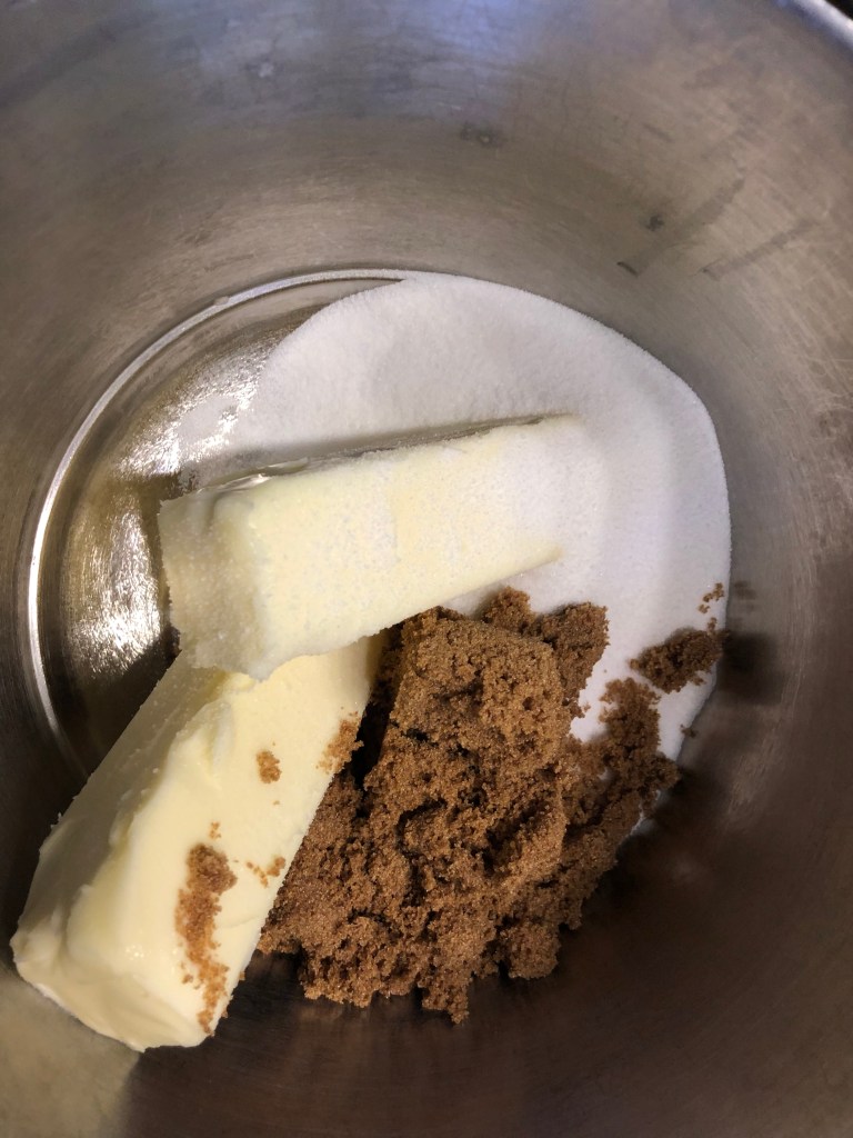 In bowl 2, cream butter, granulated sugar and brown sugar.