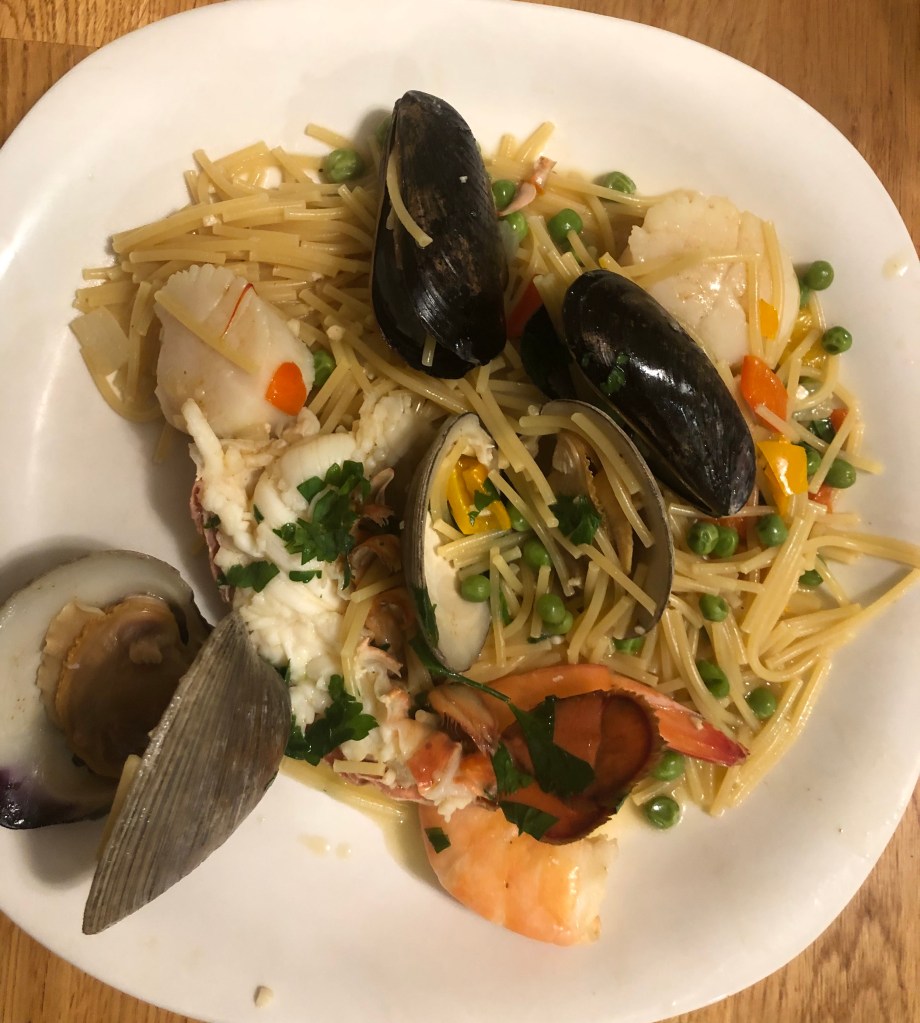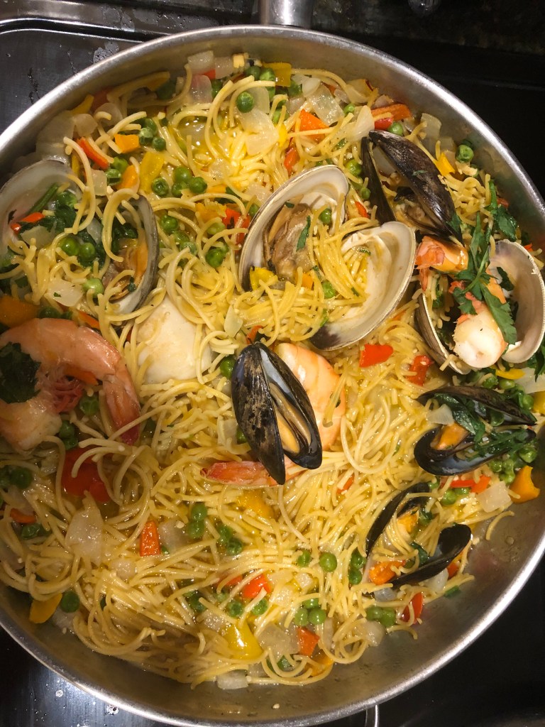 This is another way of doing the classic paella. The usual way is with rice. I was speaking with the owner of OBRADOR* Spanish bakery, and she told me that they use spaghetti instead of rice in the dish in her region of the country. Wow! I thought this is something worth trying. There are some things that are consistent: great seafood , the sofrito, and the saffron. Two warnings: 1) Be careful not to overcook the seafood, and 2) don’t overcook the pasta or you’ll have a terrible pile of mush. I will also tell you the one thing I don’t like: No socarrot which is the crispy rice on the bottom of paella. Thanks to my friends at Crosby’s Crabs for hooking me up with the seafood. I hope you like it.