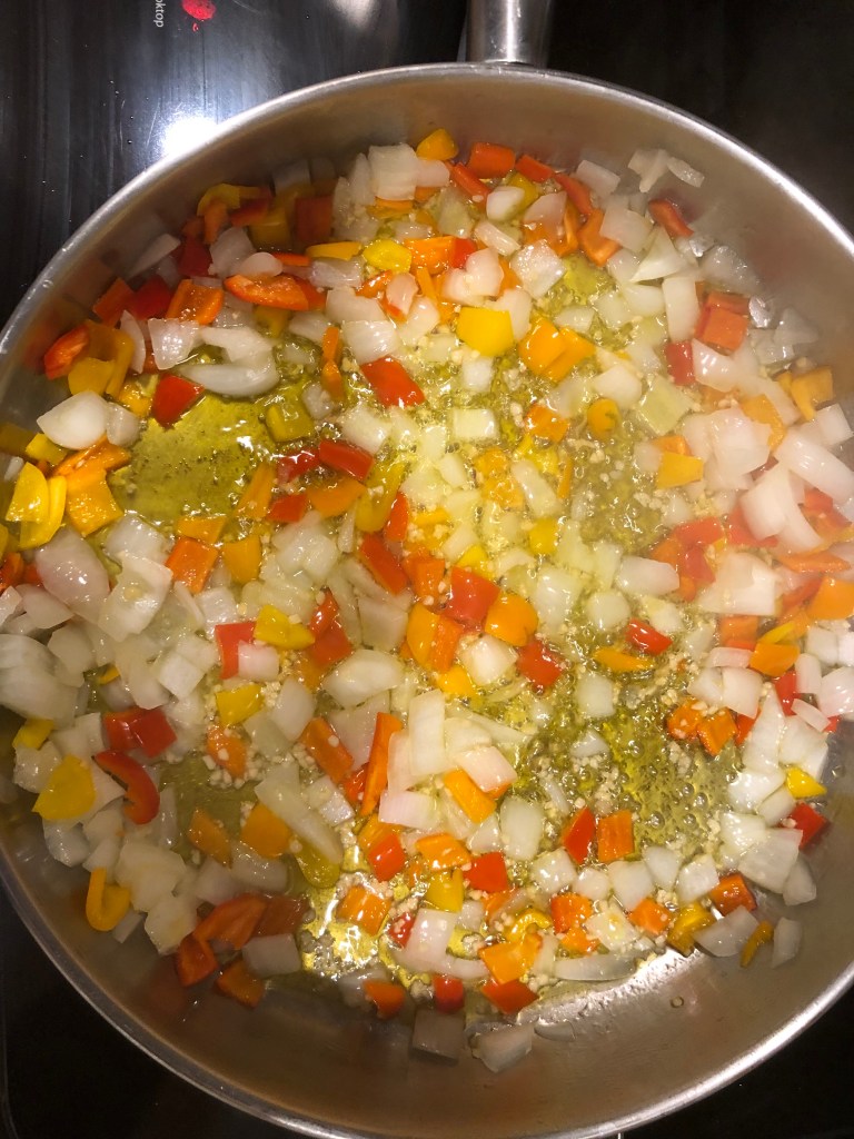 Add olive oil, onion, and green peppers. Cook for 3 minutes, then add garlic