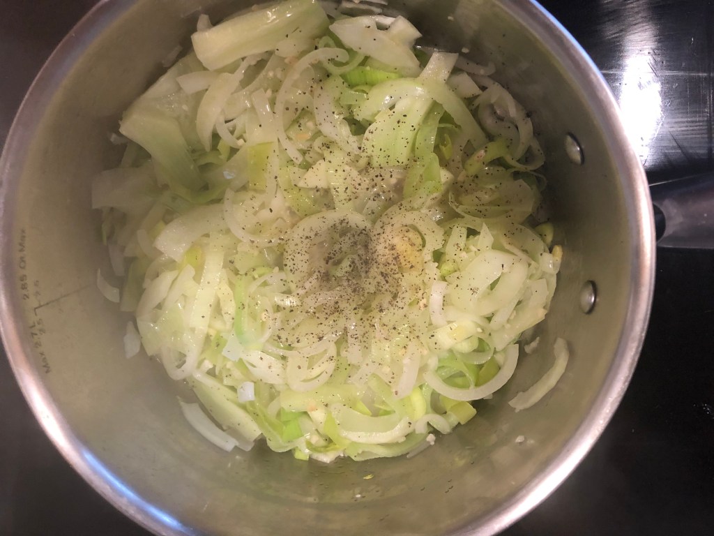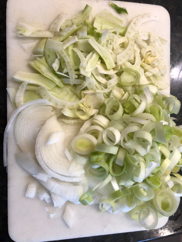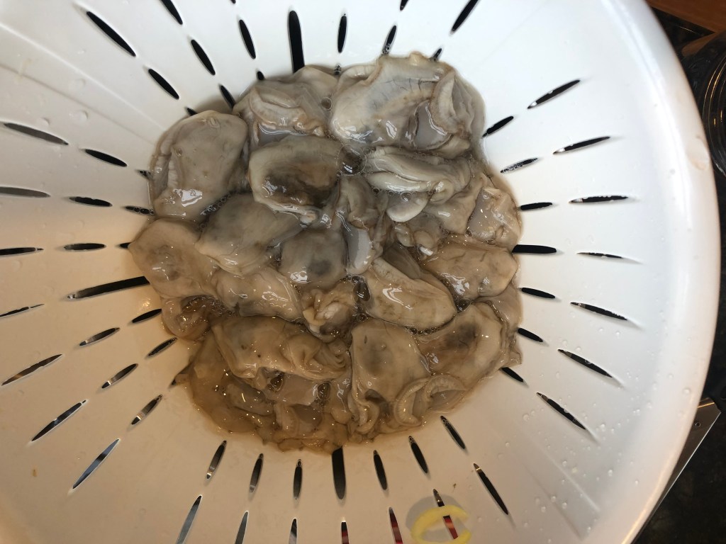 It’s almost winter, and it’s getting cold and snowy. A hot bowl of oyster stew might get you through the day. Now, my dad’s recipe was oysters, milk, and pepper. You needed a lot of oyster crackers to make the bowl worth eating. I’ve updated that to include a lot more flavor: onion, leeks, anise (fennel), and some creamy goodness. It’s flavorful and smooth with that salty sea taste. I hope you like it. Thanks to Crosby’s Crabs for getting me the stewing oysters.