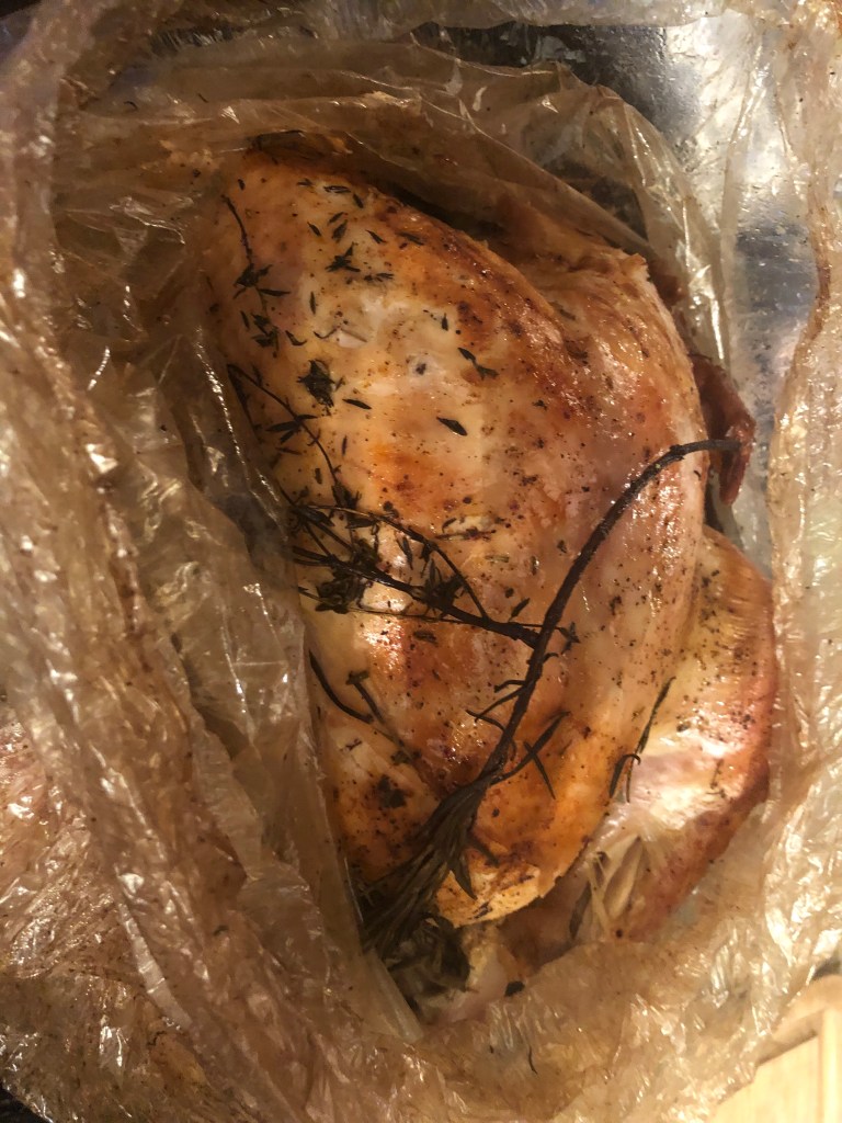 I alway cook my Thanksgiving turkey on the Weber grill. Not everyone has that technology, and some people have turkey at Christmas. This is a source of minor disagreement with my brother, who loves him some pan gravy which you can’t get using a Weber. I always compensated by cooking some turkey wings in the oven and made gravy with that. This year, we celebrated Thanksgiving at a SECURE UNDISCLOSED LOCATION, and I had to use an oven to cook the bird. I have been doing this since I was in my teens, so I had the knowledge. Here is my recipe for doing the bird in the oven and some tips for success. I hope you’re happy Uncle Mike….