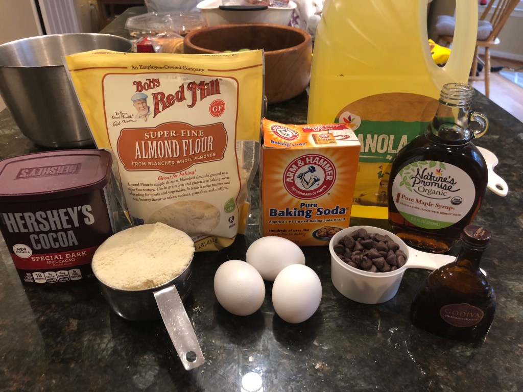 In bowl one, mix almond flour, baking soda, and cocoa.