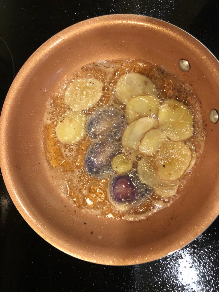 Add potato chips to duck fat and cook for 4 minutes, then turn over and cook until golden brown.