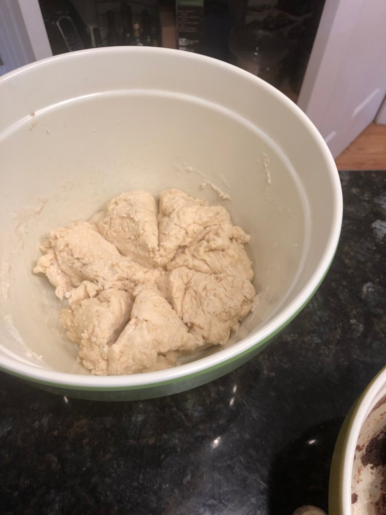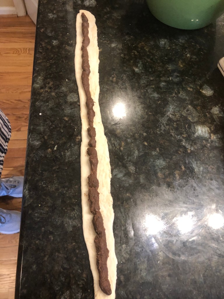 Shape cookie dough into ropes about 1/2” to 3/4” in diameter and place on pretzel dough . Wrap the pretzel dough around the cookie dough and seal tightly. Continue to roll the dough to increase the length and tighten the seal.