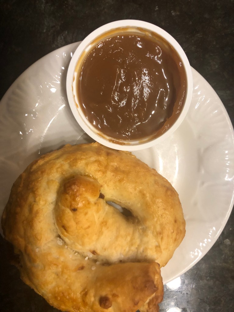 I like cookies and pretzels so why not make something that contains both? This is a football party wake-up call. It will have people talking. You have the salty soft pretzel with the chocolate cookie and the caramel dipping sauce to bring them together. I hope you like it.