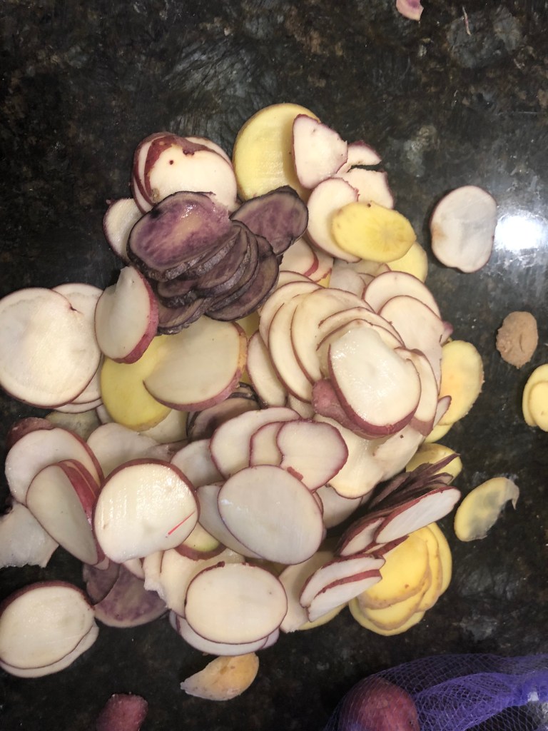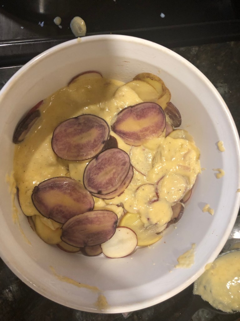 In a casserole dish, alternate layers of potatoes and cheese sauce.