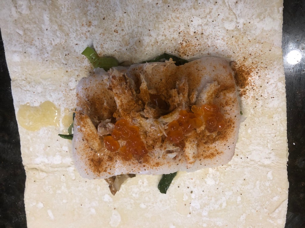 A friend of mine (Leslie) sent me a recipe for salmon Wellington, and I loved the concept.(Thank you, Leslie, for the idea). I love salmon, and I love Wellington, but I have a rule at my favorite fish place (Crosby’s Crabs): I always buy the freshest thing in the display case (unless it’s fresh lutefisk in which case I’m having a steak). So with a few additions and a few subtractions, we have a beautiful looking dish with lots of flavor notes. I hope you like it.
