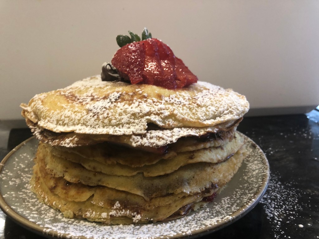 Place last crepe on top and sprinkle with powdered sugar. Add a fanned strawberry and a dollop of the hazelnut spread.