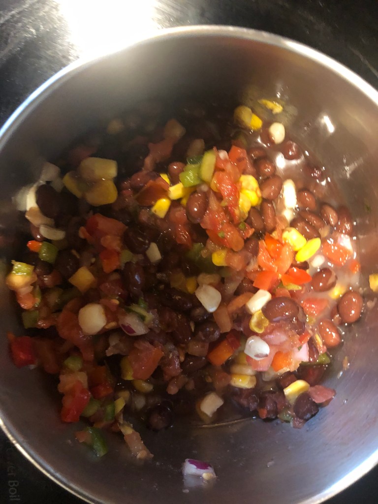 In a small sauce pan, mix onions, black beans, corn, and salsa; cook for 10 minutes on low and then add 1 tablespoon lime juice.