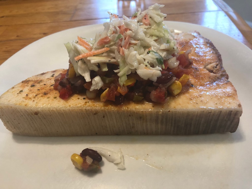 I was at my favorite fish monger, Crosby’s Crabs, and they had some beautiful swordfish. That takes me to the coast of California, Baja to be exact, for some spicy fish with flavorful salsa and coleslaw with a pop. I hope you like it