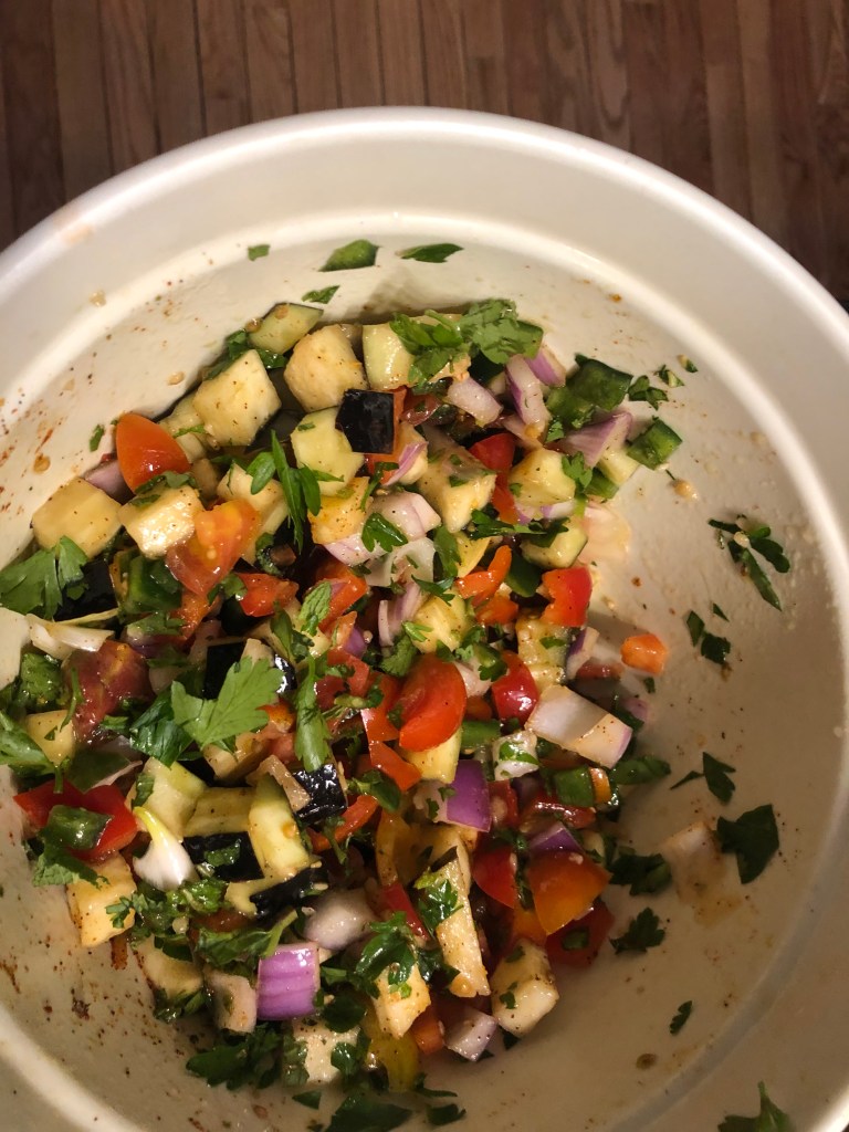 This is a delicious dare. I will warn you – it is labor intensive. It has eggplant salsa and eggplant meat. So much eggplant. You can do this with or without meat. It has southwest flavors with a hint of Turkey. (It’s the only way for the spices to work.) I hope you like it.