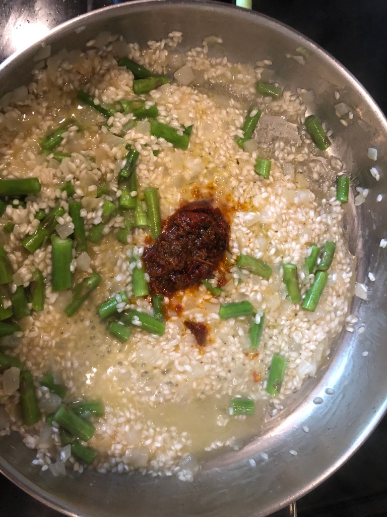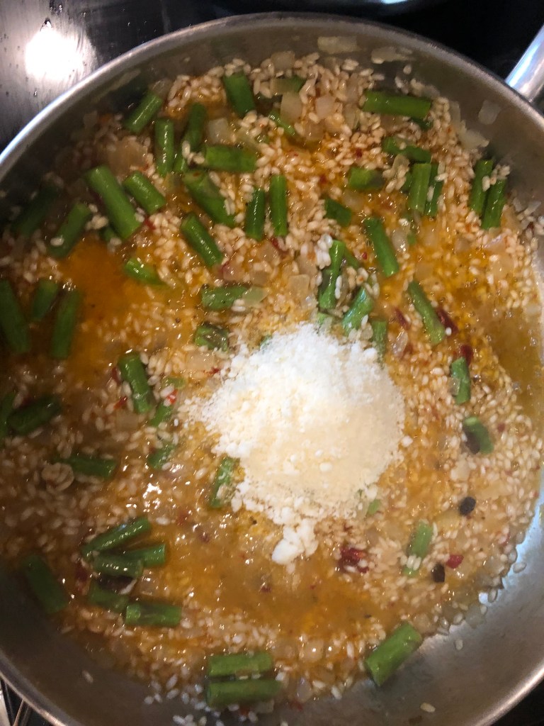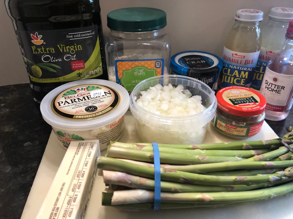 I never had risotto growing up or crab meat or asparagus other than out of a can. So this is a recipe that shows I’ve come a long way from Detroit. My younger daughter was the one who introduced me to risotto, and now I know that fresh asparagus is better than canned. My days at Superior Fish got me to love crab. Now, I also used Papa G’s pepper sauce to get the pop that I would get from Calabrian chilis (no, I’m not Bobby Flay), but be careful and taste first; you don’t want to overpower the dish. I hope you like it.