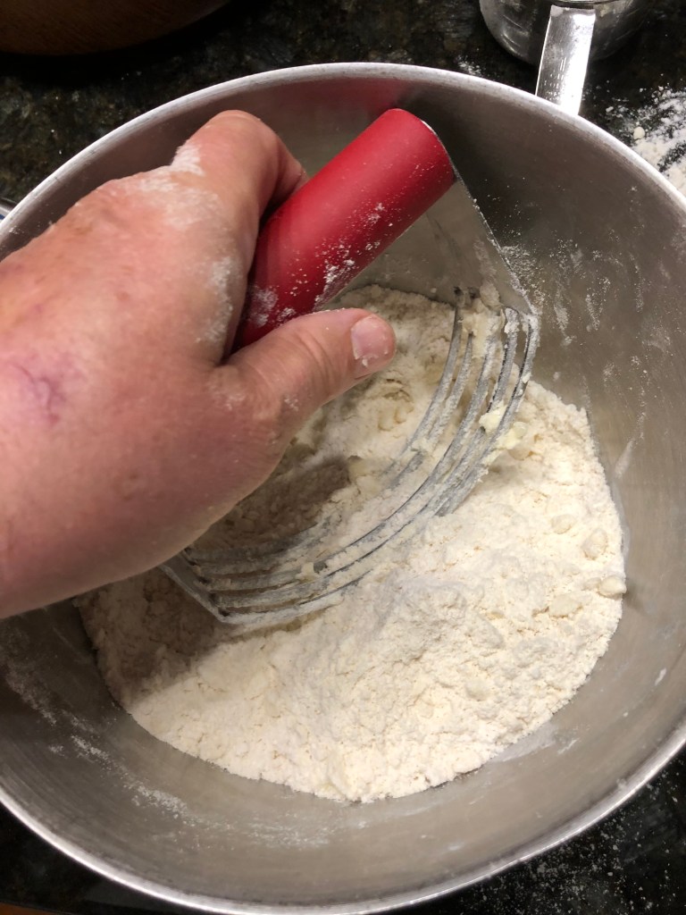 Cut butter into flour mixture, making wet sand- like consistency.