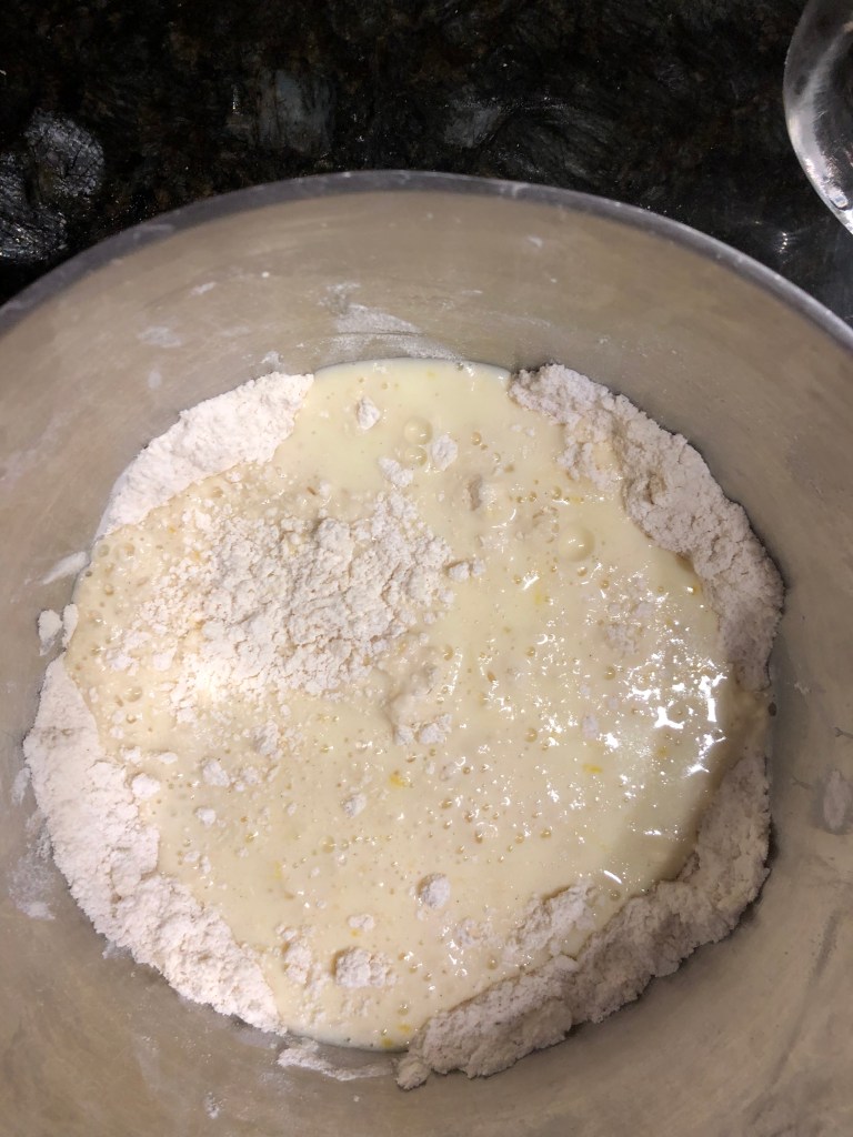 Mix egg and milk and then pour into flour and butter mixture.
