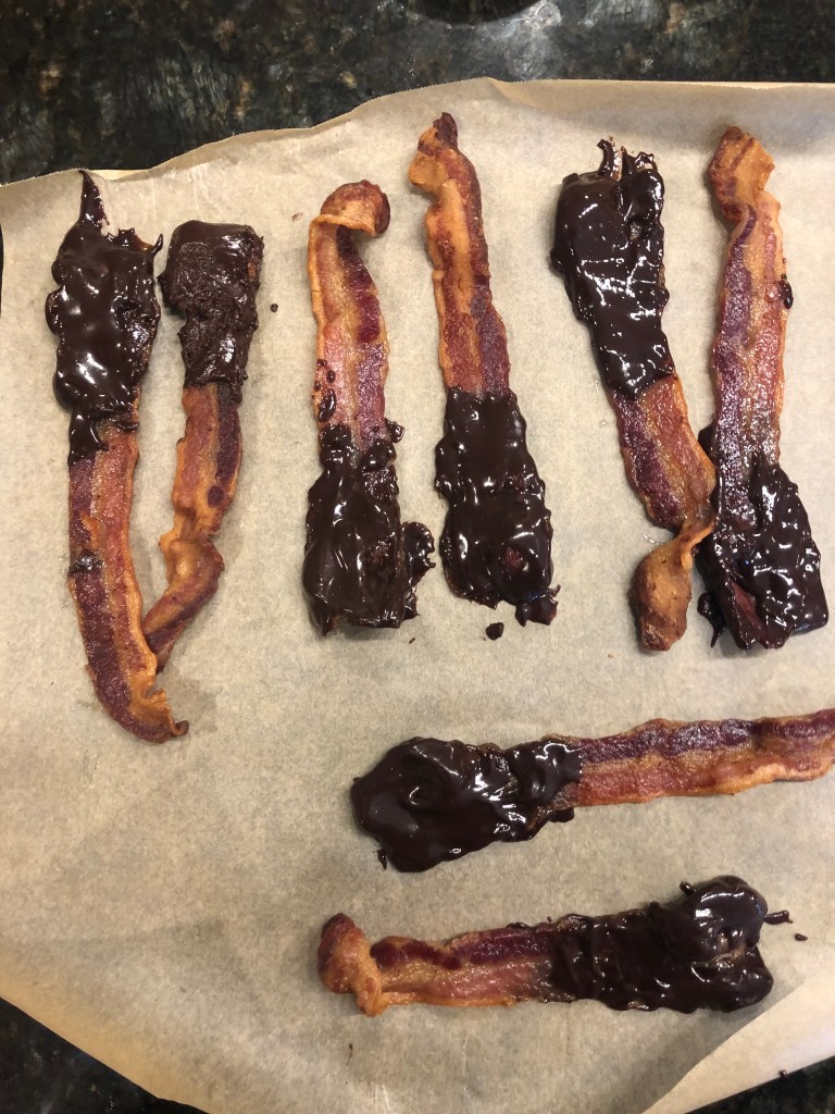 Dip top half of each bacon strip in chocolate and make sure both sides covered; then place on wax paper until chocolate sets.