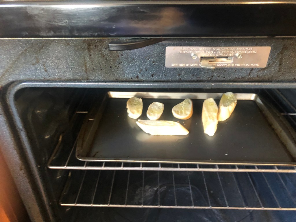 1 loaf French bread, sliced on a 1/2 inch bias or 3 everything bagels sliced crosswise