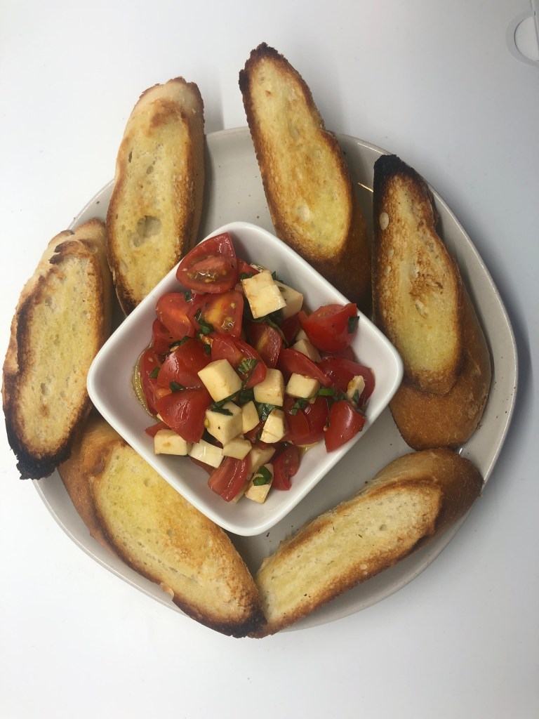 I had this dish at Osteria Cicchetti in Wilmington, North Carolina and loved it. (They also had to the best cioppino I have ever had, but more in that in a later post.) This is ideal for summer, and the grill is a perfect place to toast the bread, but your broiler will work great too. The topping is refreshing and flavorful. I hope you like it.