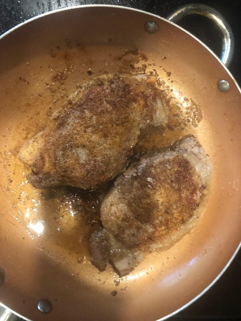 Place pan in oven for 15-20 minutes until pork chops reach an internal temperature of 150.