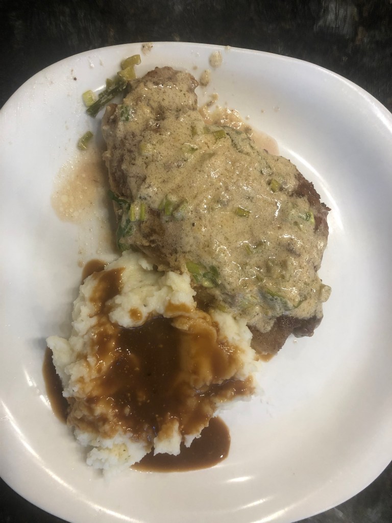 This is a hearty stick-to-the-ribs meal. The pork chops are juicy and well-seasoned. You get the smoky bacon, garlic, and some tang from the mustard. I hope you like it.