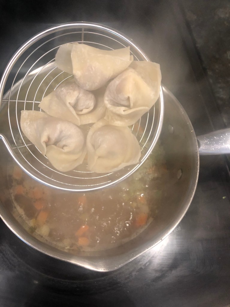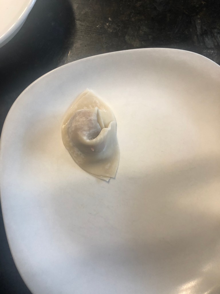 Put 1/2 teaspoon of sausage in wonton wrapper; wet outside of wrapper, fold over seal and pull bottom so that it looks like the picture below.