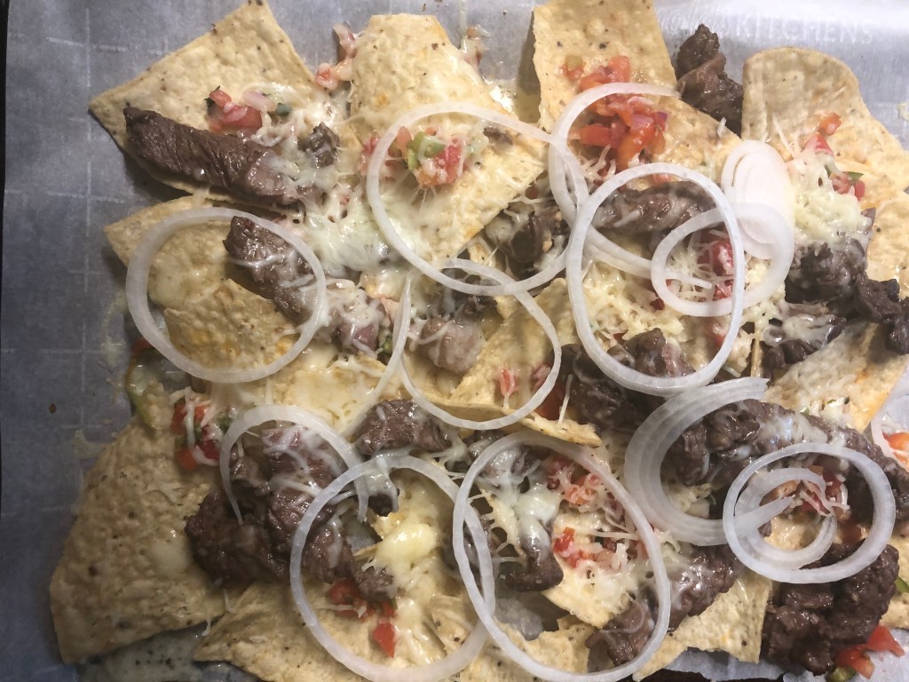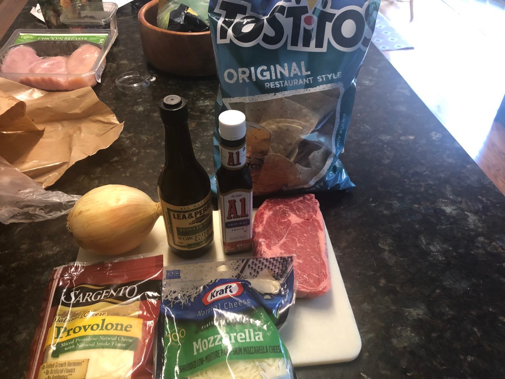 Farmers markets are open. That doesn’t mean you have time to cook or menus planned; it’s just look in the fridge and wing it and see what you forgot you bought on Saturday. I remember vendors had onions, green peppers are n season. Ok the ribeye will thaw quick. The cheese hasn’t gone bad. Who doesn’t have some chips on the fridge so there is dinner. I hope you like it.