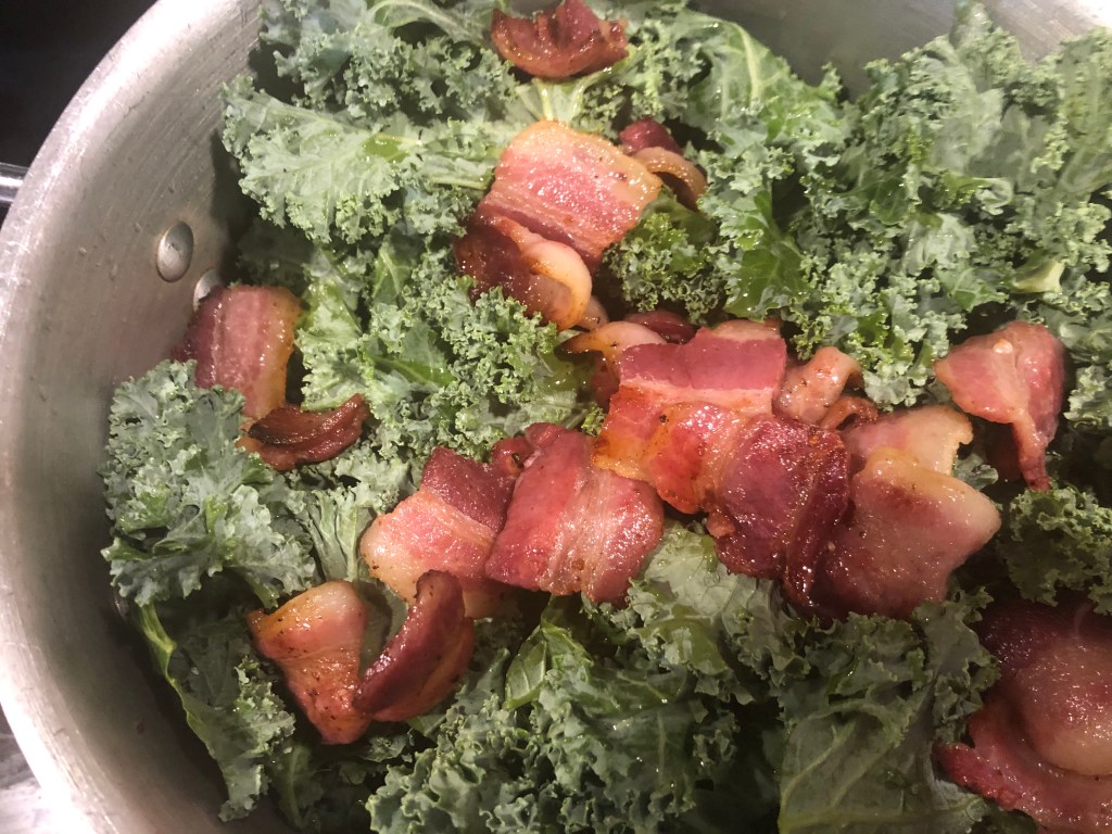 Add greens, red pepper flakes, vinegar, and bacon. Cook on medium low for 45 minutes.