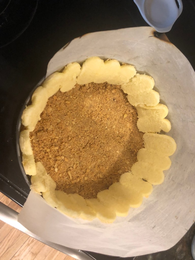 Place mixture in bottom of springform pan and press forming a 1-1/2 inch high ridge on the sides.