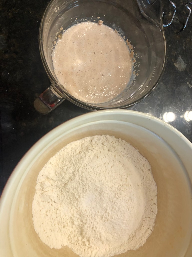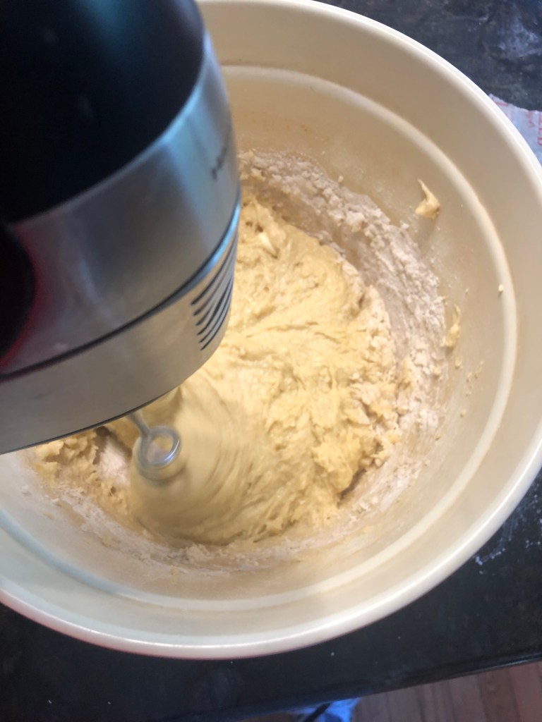Add milk, butter, and eggs to flour and mix with the mixer’s paddle attachment.