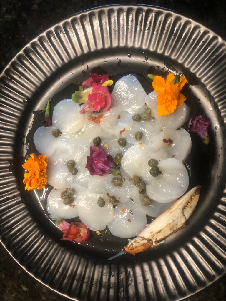 This is an appetizer that I do when scallops are fresh and in season. They are raw so be careful. You can substitute fresh fish but be careful always to use a trusted fish monger. Please no bottled juice; squeeze it – you want the best on this dish. So no cheap olive oil – you want extra virgin. I hope you like it.