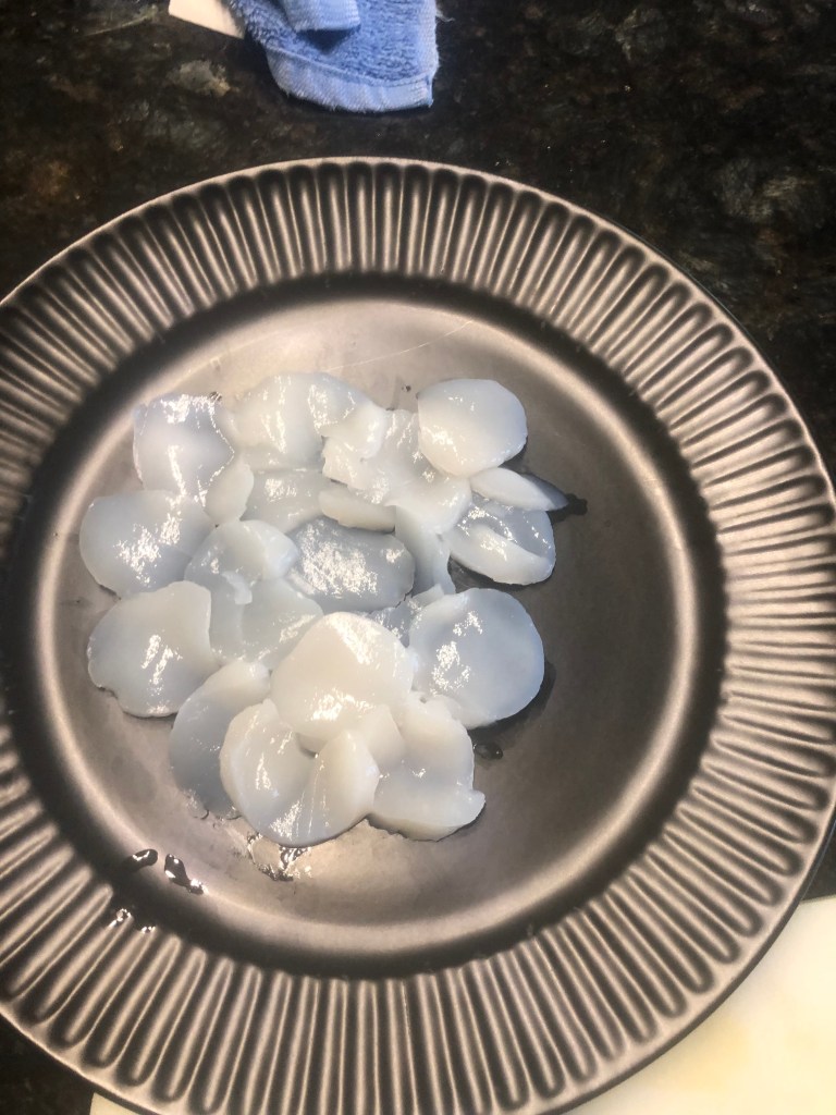 4 large fresh sea scallops (from Crosby’s Crabs) cut really thin