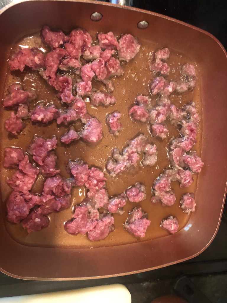 In a 10 inch skillet on medium, add olive oil and lamb and brown; remove when done.