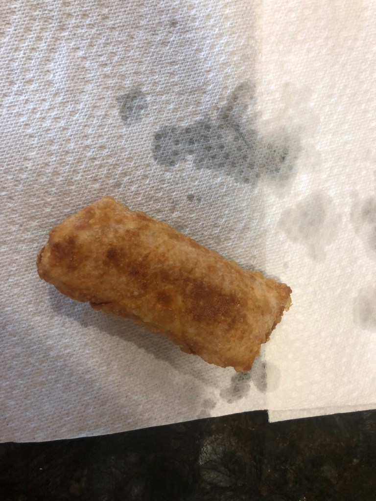Place the egg roll wrapper in front of you like a diamond. Leave the bottom 1/3 of the wrapper empty as you put the fillings horizontally in the order below, but don’t overstuff!