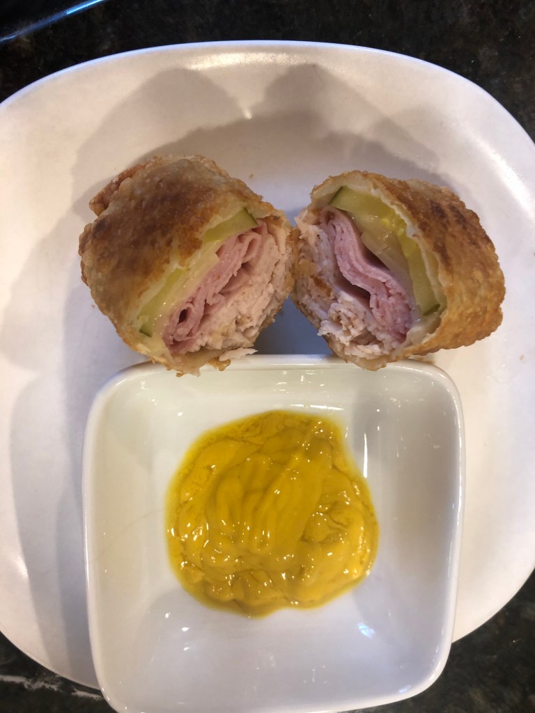 The Cuban sandwich is my favorite, hands down. I do have a problem with it though – it’s not easy to eat with one hand which is critical during football season. So I put all the tasty fillings in an eggroll. I now have one hand free for chips, the remote, or a drink. I’ve kept the flavorful pork, the ham, the swiss cheese, even the pickle and mustard. You still get the crunch without the bread. Now, I tried to bake these and air fry them, but deep fried is the way to go.