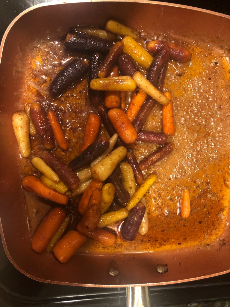 This is an eye catcher on the holiday table while also bringing the flavor. There are farmers markets or stores that sell tri-color carrots. I could have used all the individual spices which are many, but I just used Harissa, a middle east spice blend which has them all. Now the finishing touch is pomegranate molasses which adds a sweetness and a tart punch. I hope you like it.