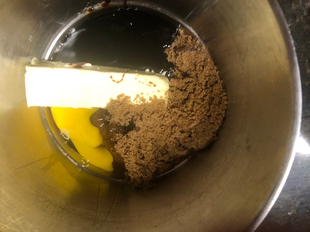 Mix dry ingredients into wet ingredients in 3 parts; mix until no flour shows..
