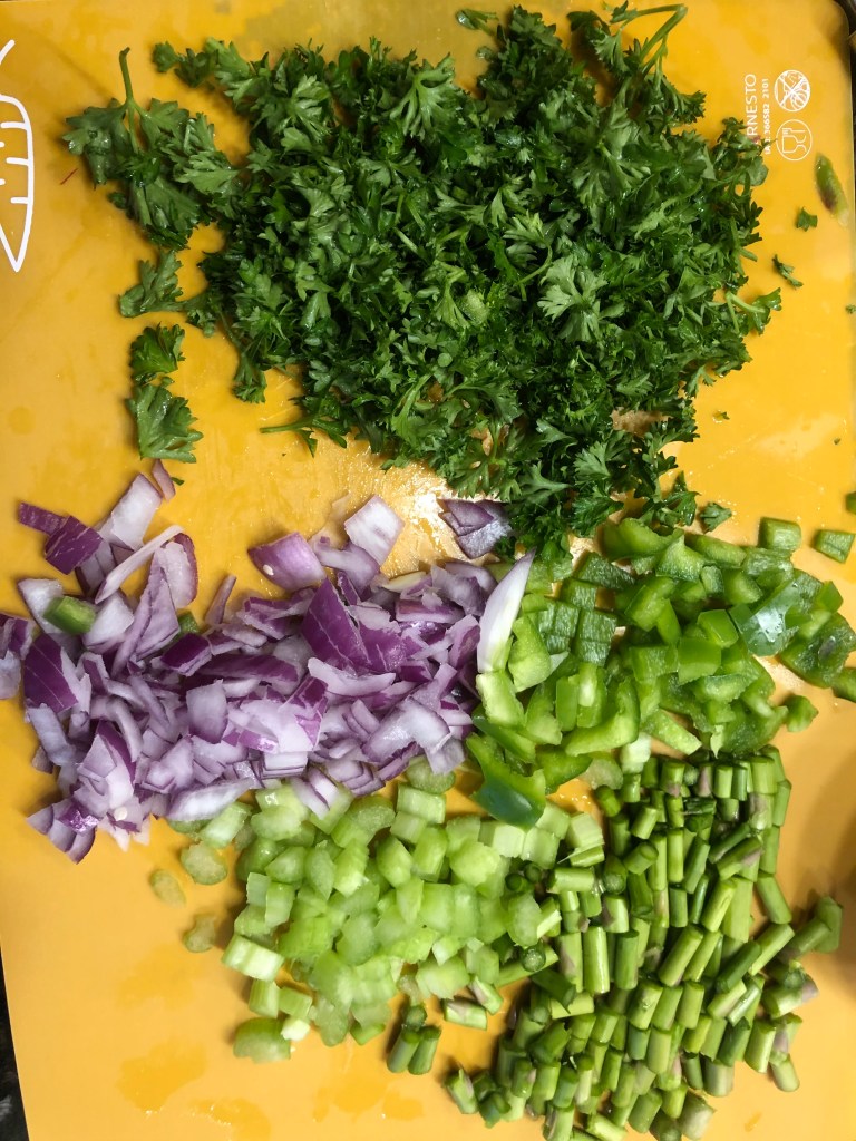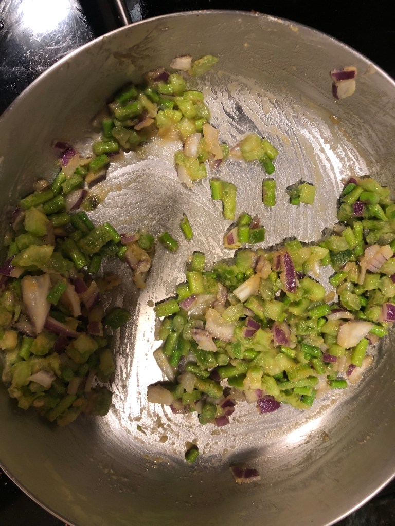Add onions, asparagus, celery, and green pepper and cook for 5 minutes. Please stir constantly or it will burn.