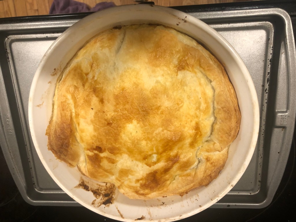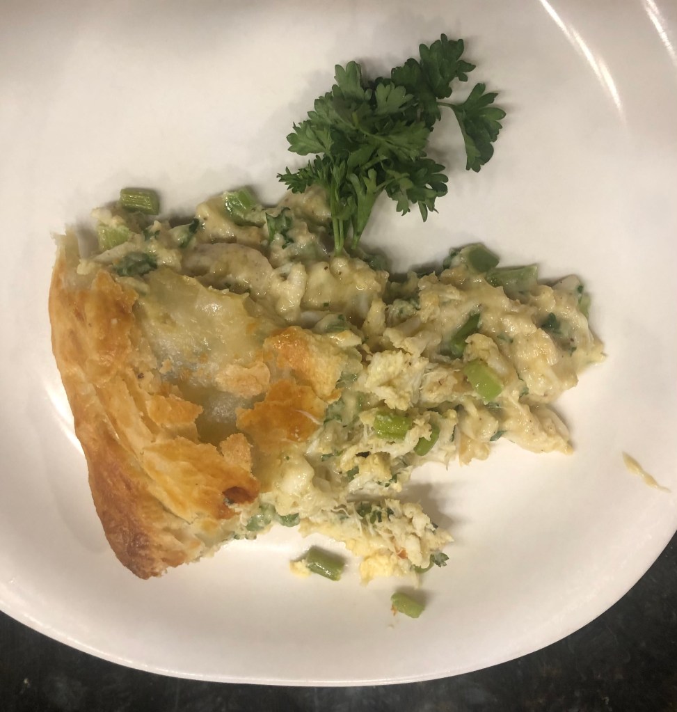 I am still a sucker for New Orleans and their rich spicy foods. Crab pie certainly fits that bill. Now, my abnormal moves are as follows: crust on top not the bottom, and puff pastry instead of pie crust. I also added asparagus to the traditional celery, onions, and bell pepper. I hope you like it.