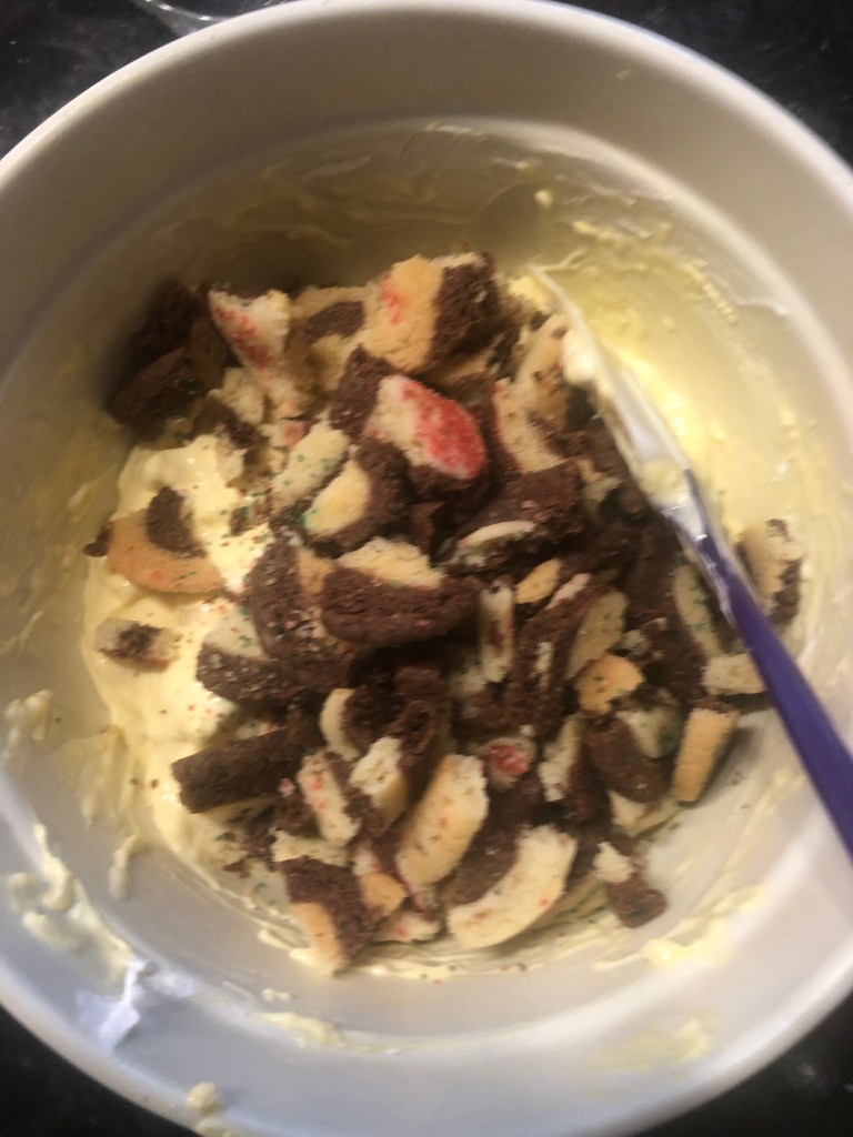 My doctor told me to eat more salads. He was not very specific, so I did some research and found this idea. So I hate to waste perfectly good cookies, so let’s repurpose leftover Christmas cookies to make cookie salad. This dish is said to have started in Minnesota and spread over the mid-west. If you read the ingredients, this should not work,but it does. I hope you like it.