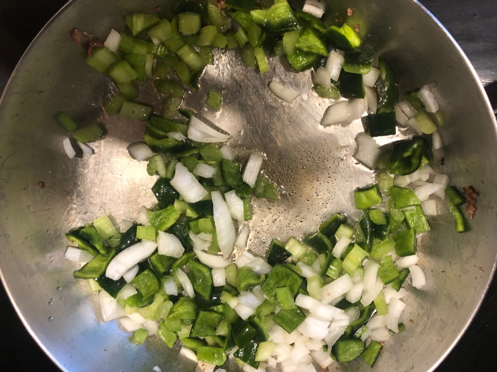 Add 2 tablespoon of oil to skillet and add onion, celery, and green pepper; cook until soft, stirring about 4 minutes.