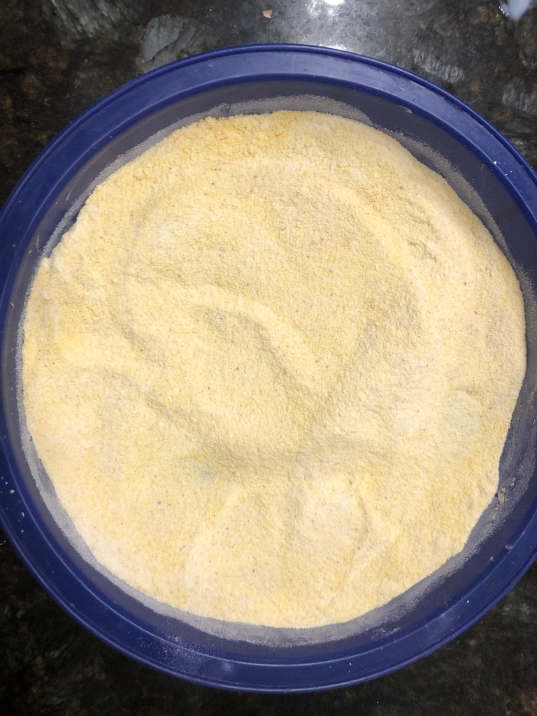 Mix rice flour, corn meal, Old Bay, garlic powder, and pepper.
