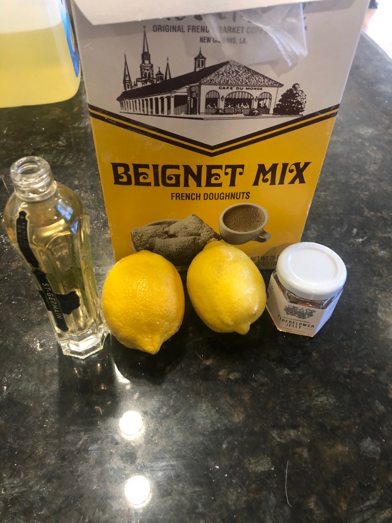 When I make beignets, they are part of a brunch. That means I am making at least four other dishes, so I need shortcuts. I admit with some effort I can make a good beignet, but if I can make a better one using a box mix, why not? Now, that provides the chemistry part; the flavor component is all me. I used Erin’s Elderflower Jelly (www.erinselderberries.com/), elderflower liqueur, a lot of lemon zest, a little kneading, and we have something to wake up for. I hope you like it.