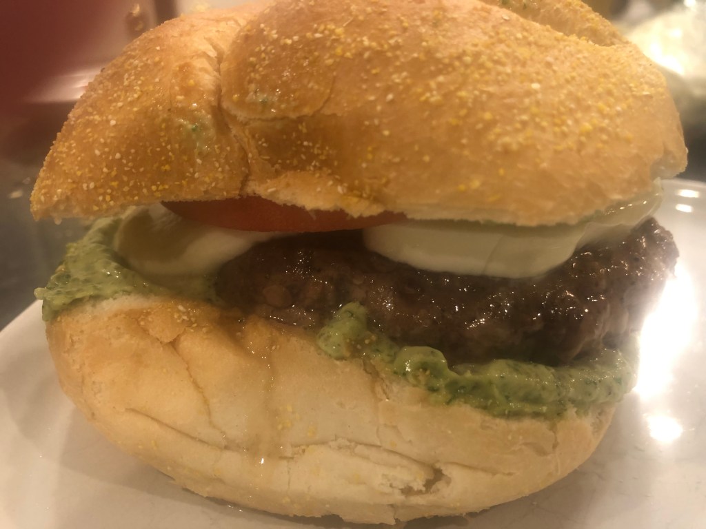 i say ho hum to fast food burgers . If I eat a burger, it has to be something special, something with a lot of flavor. The pesto on this burger gives it a lot of flavor, the tomato freshness, and the ooey gooey cheese is just plain fun to eat.