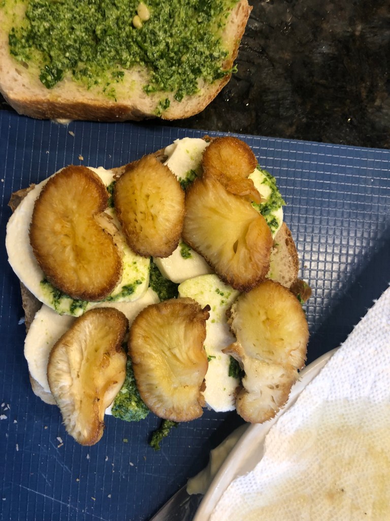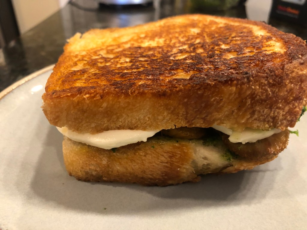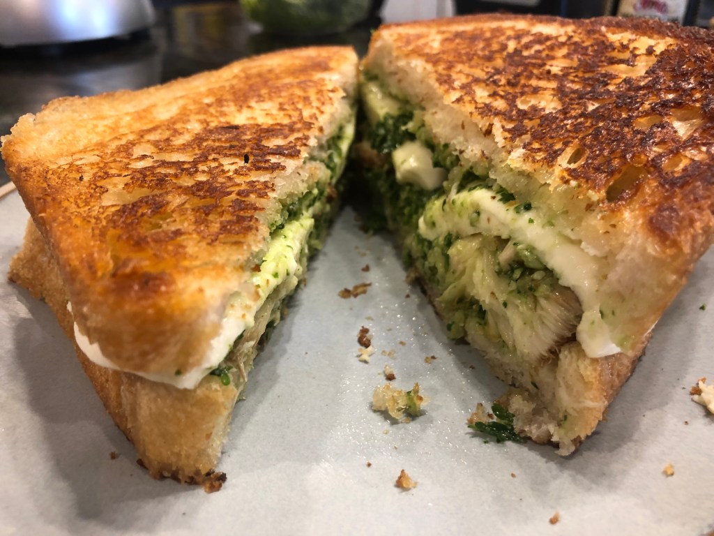 This is an adult grilled cheese. Earthy mushrooms from The Fruitful Forest , zingy, pesto, sourdough bread from Great Harvest Bread, and ooey gooey cheese. Simple.