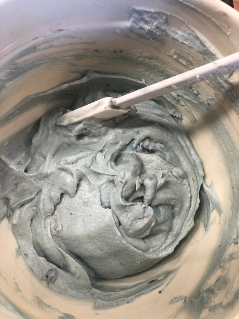 In a bowl, add whipping cream, powdered sugar, blue food color, and vanilla and beat until stiff peaks.