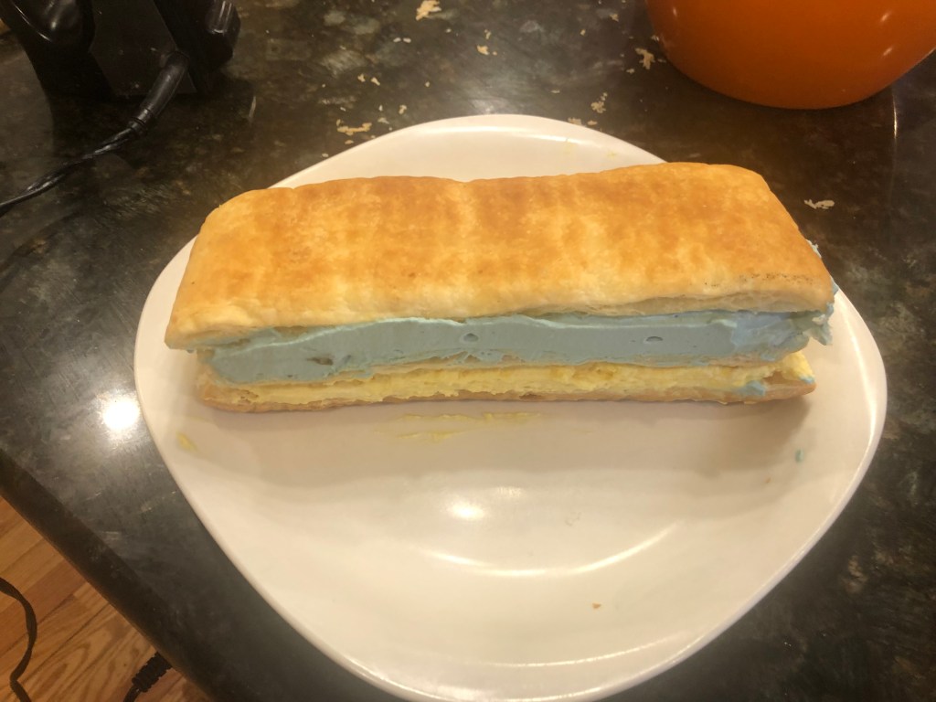 Mix powdered sugar and cream until smooth and divide. In two bowls and add blue food color to one and yellow to second and frost the pastry to your liking.