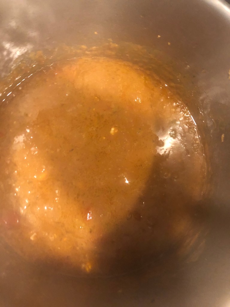 Add flour and whisk to combine. Now, here is the bad news: you will have to whisk for the next 20-25 minutes until it becomes a chocolate color. Keep an eye on it; if it burns, you have to do it all over again.